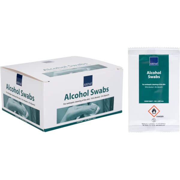 ABENA Alcohol Swabs desinfektiopyyhkeet sisältävät 70% etanolia sekä 2% glyseriiniä ja soveltuvat ihon antiseptiseen puhdistukseen.